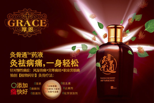 灸骨通藥液:穴位為門、植物藥作針,入骨無形,利用生物發酵技術提取的藥液,將原藥材大分子微化分解為納米小分子,如毫針般細密透皮、溫灼穴位,通過經絡的放大作用滲透皮肉筋骨脈...
